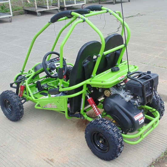 Es ist ein doppelter Sitz, volle Suspension Buggy Kinder ausgestattet mit 163cc, 5.5hp Motor elektrische Start mit Pull-Start-Backup und verfügt über 2-Rad-Antrieb und Zentrifugalkupplung, einfach in der Steuerung mit Stop / Go-Fußpedale.